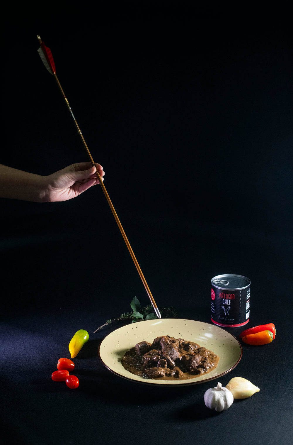 Carne de ciervo, cebolla, zanahoria, champiñón deshidratado, mantequilla, aceite de oliva, aceite de girasol, caldo de carne, crema, ajo chilote, perejil deshidratado, sal, especias.