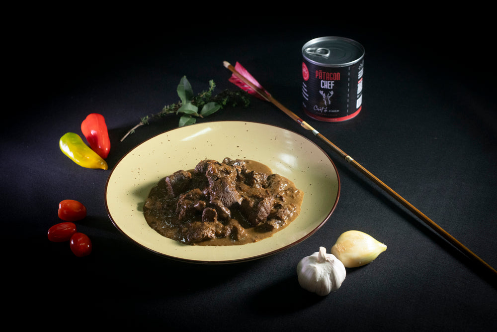 Estofado casero de carne de ciervo, cocinado a fuego lento con ingredientes como verduras de la huerta, caldo de huesos con alto contenido en colágeno, champiñones y crema.